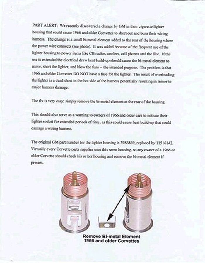 PART ALERT: We recently discovered a change by GM in their cigarette lighter housing that could cause 1966 and older Corvettes to short out and burn their wiring harness. The change is a small bi-metal element added to the rear of the housing where the power wire connects (see photo). It was added because of the frequent use of the lighter housing to power items like CB radios, coolers, cell phones and the like. If the use is extended the electrical draw heat build-up should cause the bi-metal element to move, short the lighter, and blow the fuse — the intended purpose. The problem is that 1966 and older Corvettes DO NOT have a fuse for the lighter. The result of overloading the lighter is a dead short in the hot side of the harness potentially resulting in minor to major harness damage. The fix is very easy; simply remove the bi-metal element at the rear of the housing. This should also serve as a warning to owners of 1966 and older cars to not use their lighter socket for extended periods of time, as this could cause heat build-up that could damage a wiring harness. The original GM part number for the lighter housing is 3986869, replaced by 11516142. Virtually every Corvette parts supplier uses this same housing, so any owner of a 1966 or older Corvette should check his or her housing and remove the bi-metal element if present